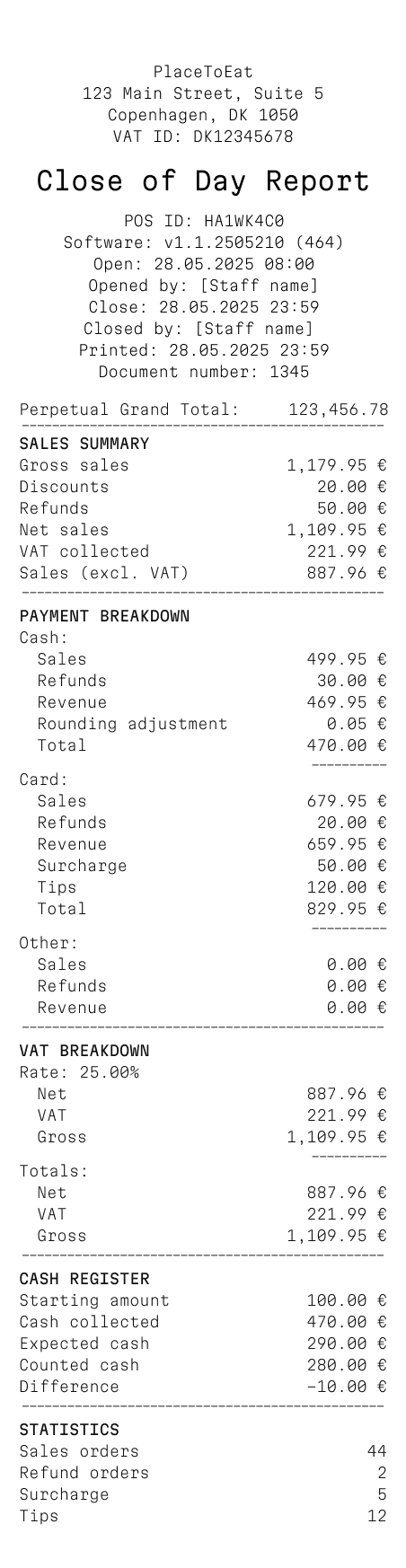 When you end your day on your POS, a report is automatically printed with an overview of the day called the "End of day report". All these reports can also be found on the customer portal: HERE.