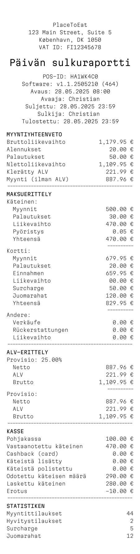 Kun lopetat myyntipäivän POS-järjestelmällä, tulostaa järjestelmä automaattisesti yhteenvedon päivän myynneistä. Tätä kutsutaan "Päivän sulkuraportiksi". Kaikki päivän sulkuraportit löydät myös asiakasportaalista tämän linkin takaa..