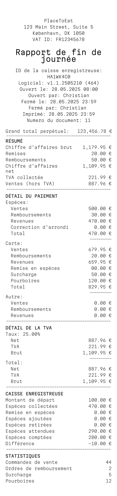 Lorsque vous clôturez votre journée sur votre caisse, un rapport est automatiquement imprimé. Ce document, appelé « Rapport de fin de journée », vous donne un aperçu complet de votre activité du jour. Vous pouvez également retrouver tous vos rapports sur le portail client : ICI.